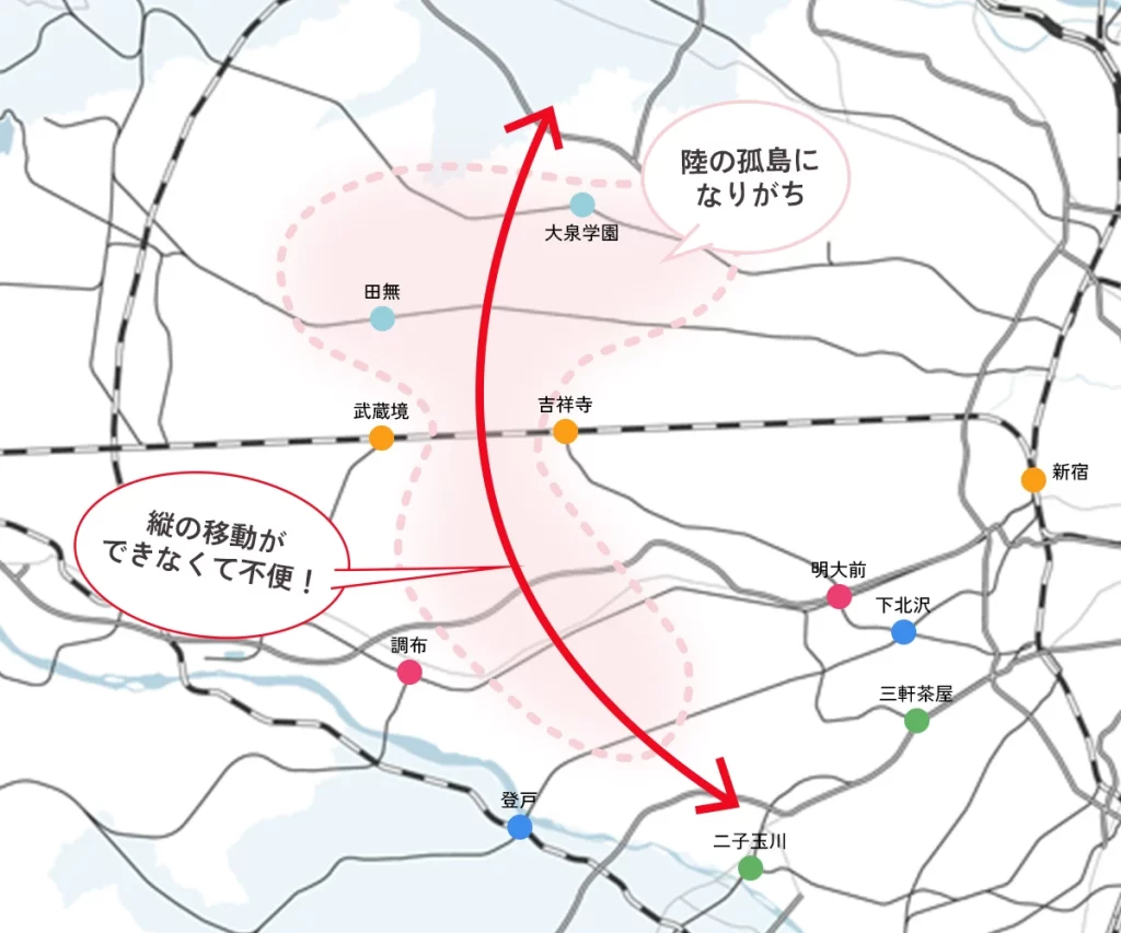 また、例えば京王線なら調布~高井戸あたりとか、小田急線なら狛江~経堂あたりに住んでいると、電車が事故などで止まった際に、「振り替え輸送が意味ない陸の孤島」と化す。振り替えで他の路線に乗ったとしても、縦移動できる路線がないため、めちゃくちゃ遠回りすることになり、それなら電車が運転再開するまでその場で待つしかない、という状況にある。